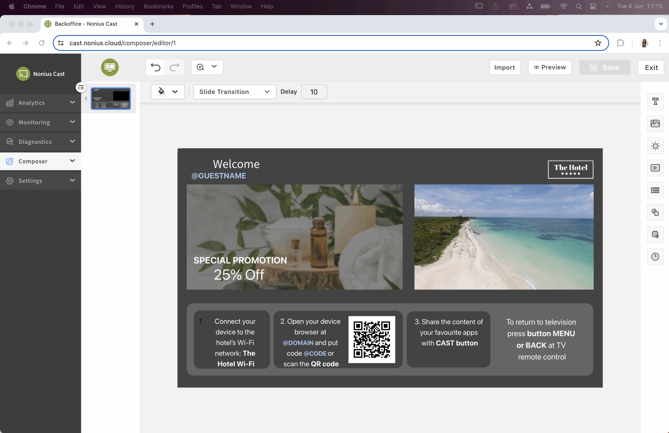 The Nonius Cast TV portal enhances marketing efforts by directly promoting services to guests. This not only saves paper and improves eco-friendliness but also enhances operational efficiency and strengthens brand loyalty. Additionally, it allows for advertising and cross-promotion of new special packages for guests’ upcoming stays, such as dining offers, facility highlights, and new property openings.