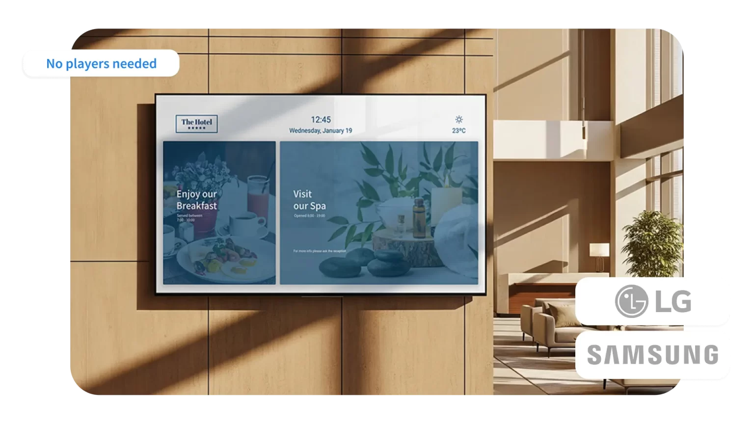 - O Nonius Signage agora funciona nativamente em ecrãs Samsung Tizen e LG webOS, eliminando a necessidade de players de mídia externos e simplificando a configuração. Os hotéis passam a gerir todos os ecrãs a partir da cloud, enquanto os hóspedes desfrutam de informações claras, dinâmicas e envolventes em toda a propriedade.