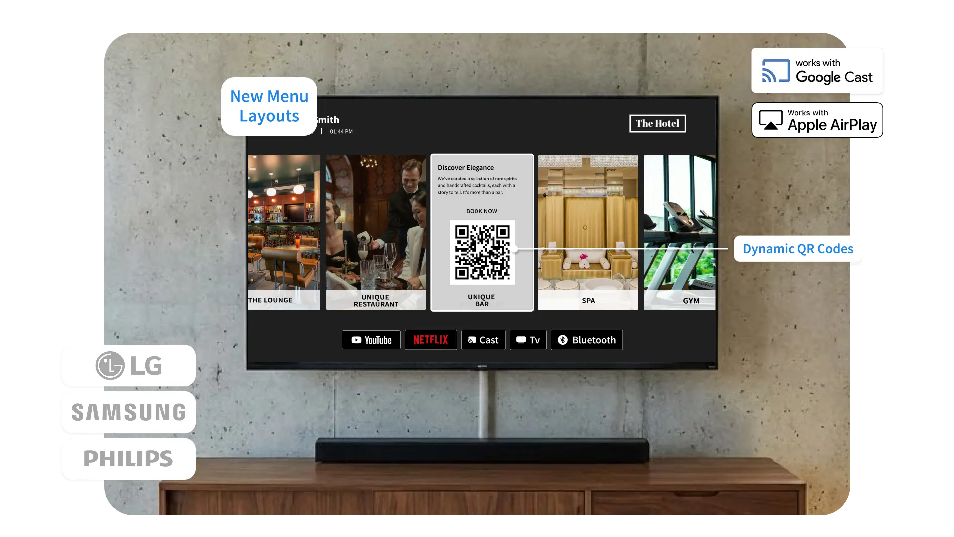 - E com os novos layouts de TV+ e um backoffice centralizado, os hotéis podem atualizar o conteúdo da marca e gerir dispositivos remotamente, proporcionando uma experiência moderna e consistente desde o momento em que o hóspede liga a TV.