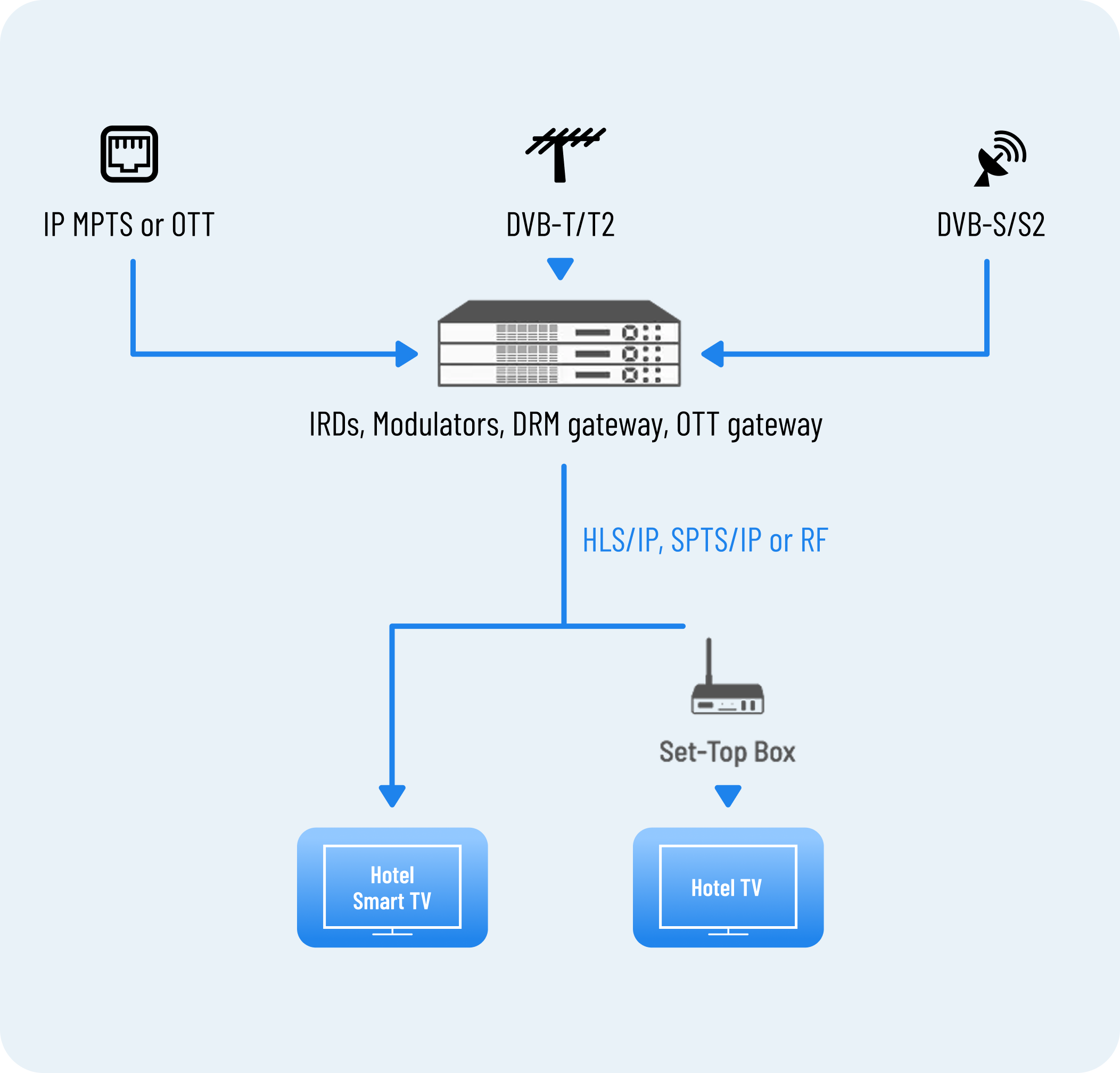 We provide a complete, cost-efficient solution designed to fit any property anywhere in the world. We handle everything from the initial design to equipment supply, professional installation, and ongoing support services to deliver TV channels to your guest rooms and public spaces.